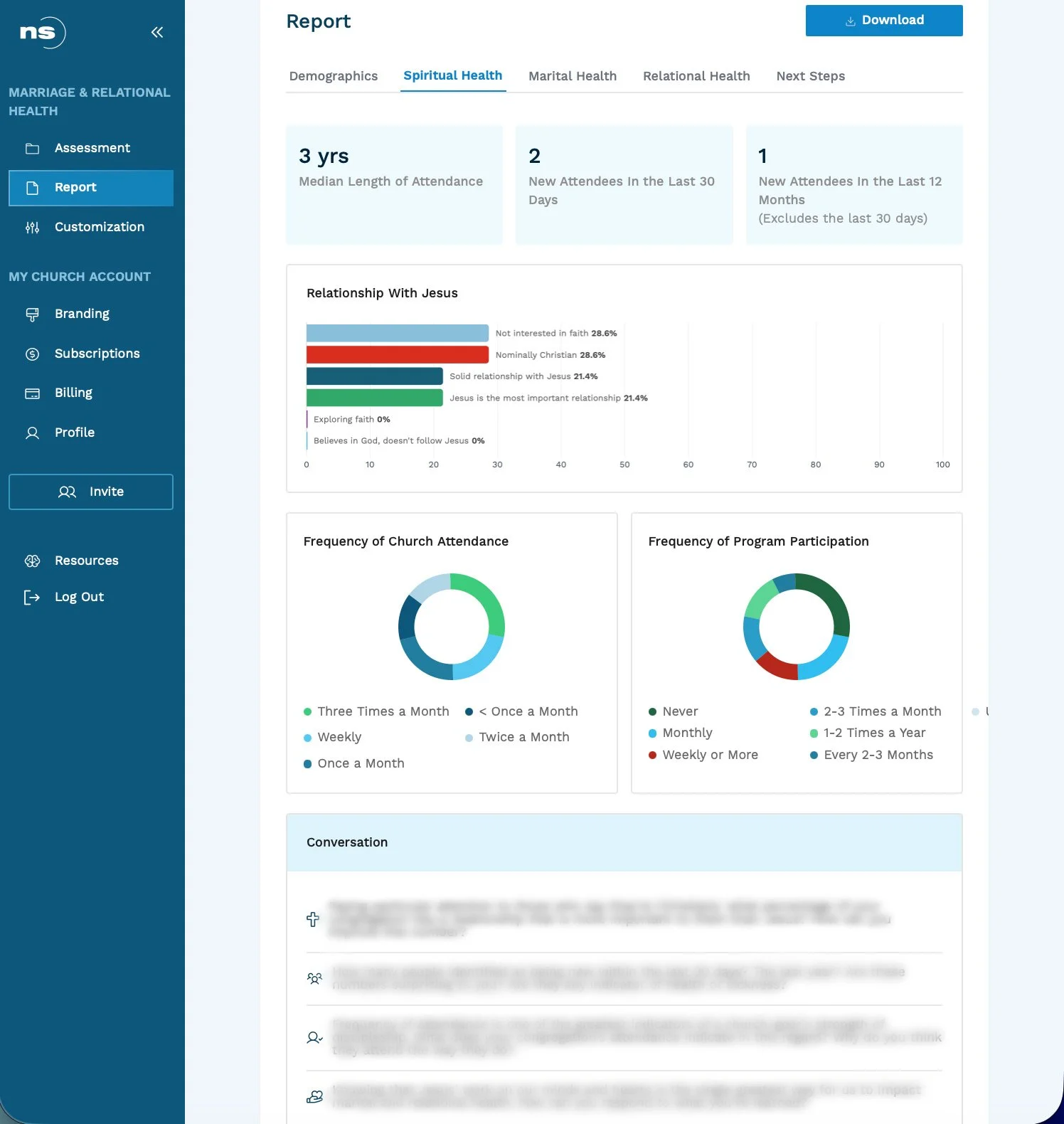 Understand your context: Explore demographics such as age, gender, race, and marital status alongside spiritual indicators like relationship with Jesus, new attendee patterns, and program participation.